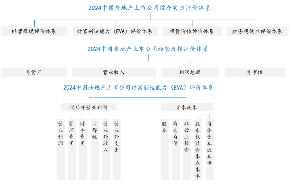 在2024中国房地产上市公司TOP10研究中,中国房地产TOP10研究组从经营规模、财富创造能力(EVA)、投资价值、财务稳健性四个方面对企业进行评价,对同一家企业在四个指标体系中的得分按一定的权重值(权重来自于对四项得分的“方差-协方差分析”)进行加总,最终得到企业的综合实力得分,评价得出“2024中国房地产上市公司综合实力TOP10”。