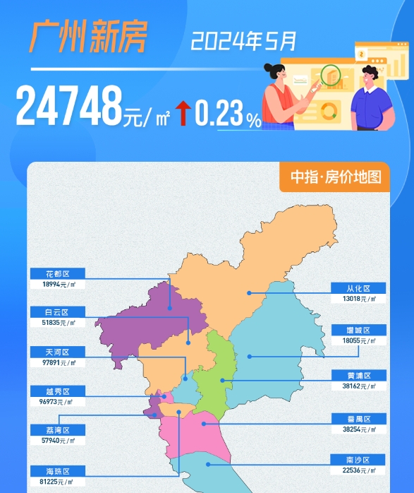 2024年5月广州新房价格为24748元/㎡,环比上涨0.23%,二手房价格为38088元/㎡,环比下跌0.71%。