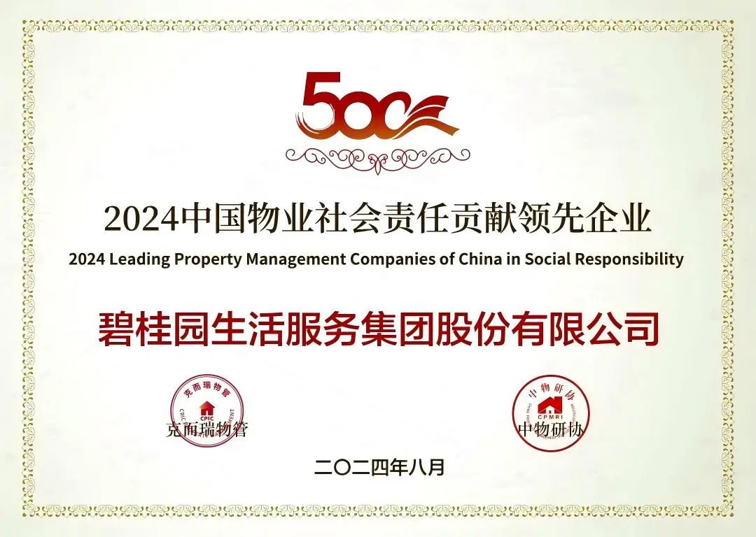 在「2024中国物业服务企业综合实力研究成果」中,碧桂园生活服务集团股份有限公司荣获“2024中国物业服务企业综合实力500强第1名”、“2024中国住宅物业服务领先企业”、“2024中国物业增值服务运营领先企业”、“2024中国物业社会责任贡献领先企业”、“2024中国物业管理卓越标杆项目——丹灶碧桂园(住宅)”奖项。
