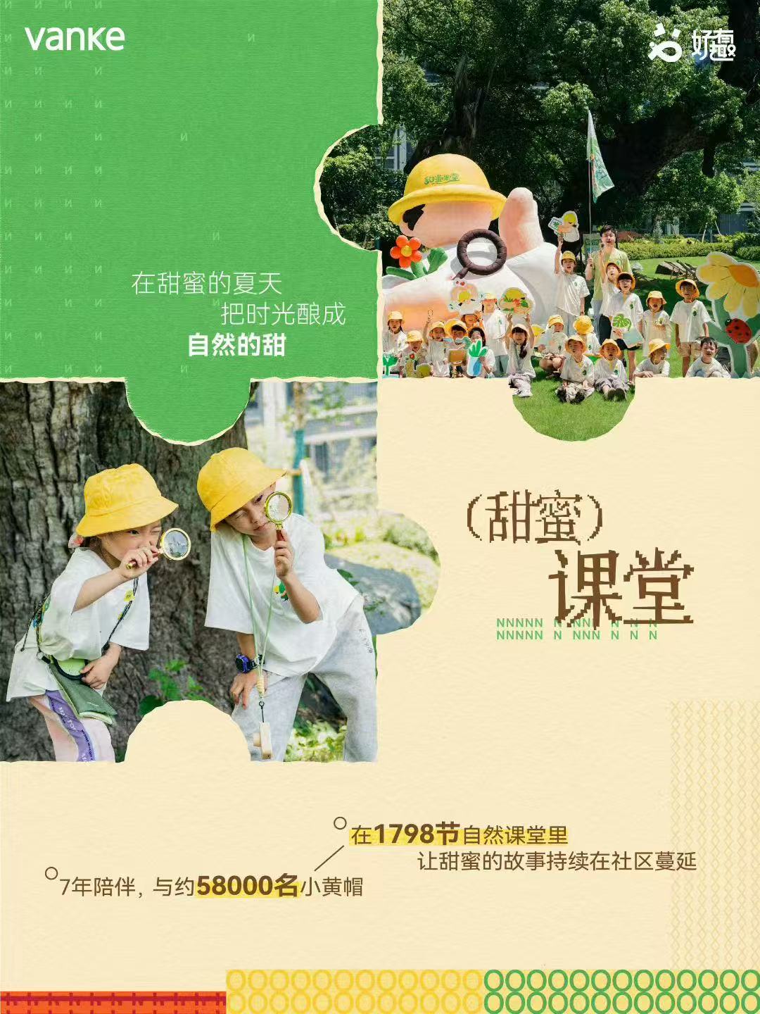 万科还将自然教育融入社区,以万科植物园为核心打造家楼下“植愈工坊”,全年开展1350场自然探索日常。其标志性的“小黄帽”自然课堂项目,7年来已陪伴约58000名孩子开展了1798节课。