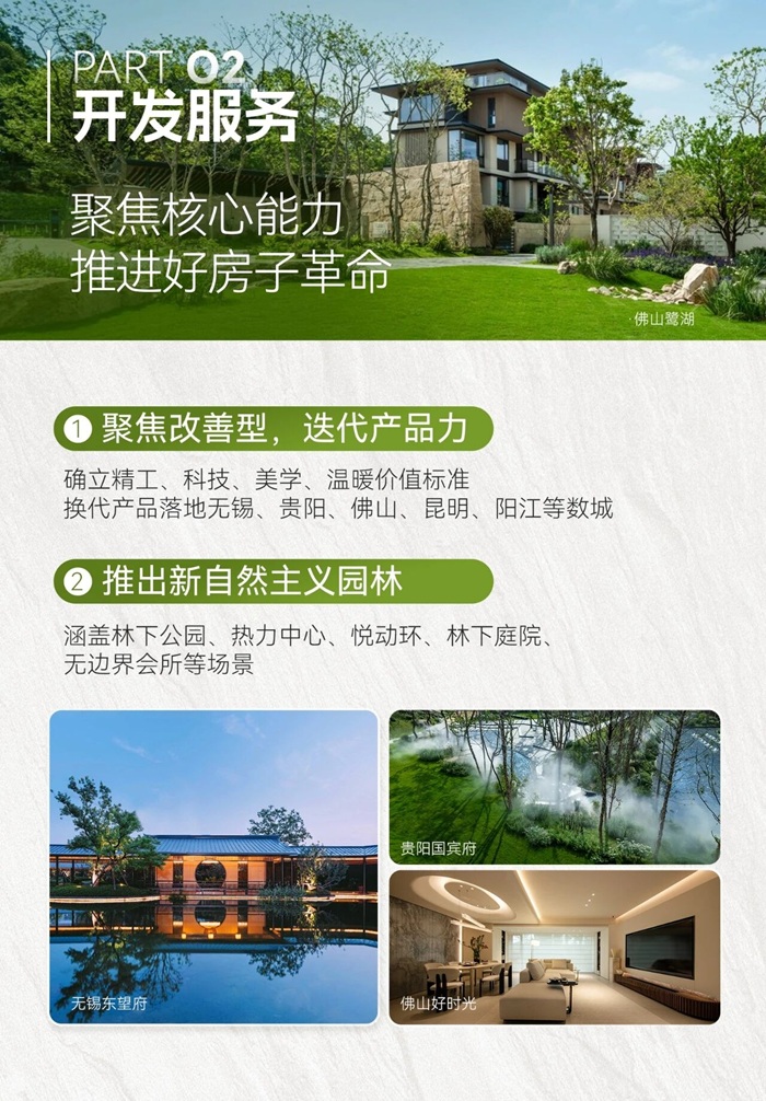 开发服务:作为2024年重组后的新增业务,全年实现营业收入9.6亿元。公司聚焦核心城市,成功拓展4个第三方项目,并恪守品质交付,全年完成64个项目、逾2.3万套交付,提前交付率达51%。同时,公司全力推进“好房子革命”,落地SIS精工技术体系与新自然主义园林,产品力持续迭代。