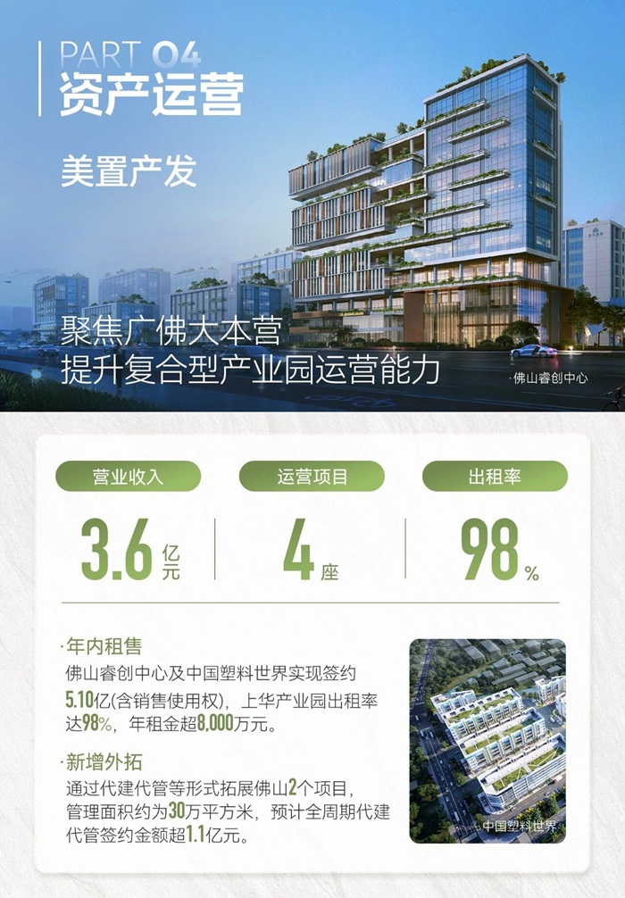 资产运营:包含美置商业与美置产发,合计贡献营收8.4亿元。商业板块聚焦自持项目运营与轻资产拓展,自持项目满铺率达93%;产发板块深耕广佛,运营项目出租率高达98%,并通过代建代管模式实现外拓增长。